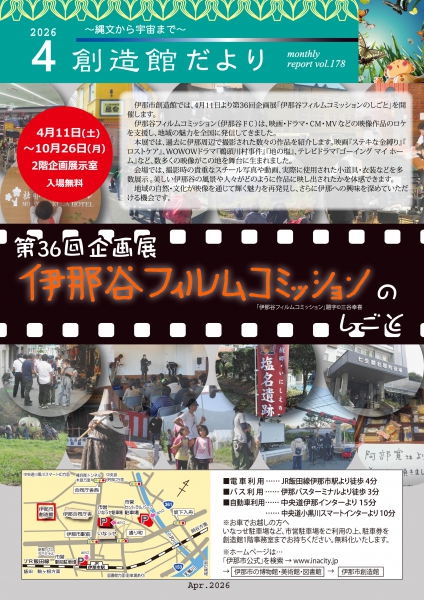 場所:伊那市創造館 開催期間:2026-04-11〜2026-10-26 お問い合わせ:伊那市役所 教育委員会 生涯学習課 創造館 電話:0265-72-6220 ファクス:0265-74-6829 メールアドレス:szk@inacity.jp